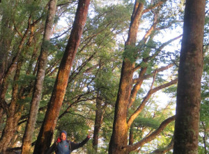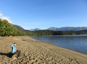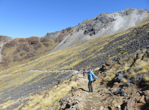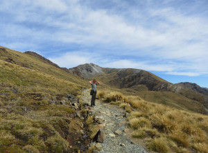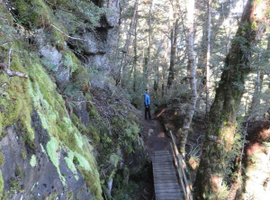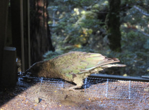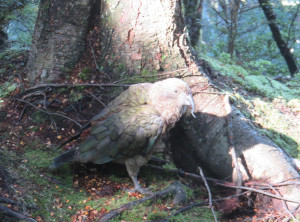 Anfangs war es noch ziemlich kalt, aber bald ging die Sonne auf und wir machten nach den ersten fünf Kilometern an einem Campingplatz am See in der Sonne unsere Frühstückspause. Danach ging es stetig aufwärts, durch den Wald. Am Ende einer Treppe wartete ein Kea auf uns – endlich bekommen wir einen dieser Bergpapageien zu Gesicht. Der Vogel war nicht scheu sondern sehr neugierig und kam direkt auf uns zu. Keas sind dafür bekannt, unvorsichtigen Leuten Essen oder andere Gegenstände wegzunehmen. Wir machten schnell ein paar Bilder und weiter ging es.
