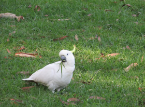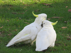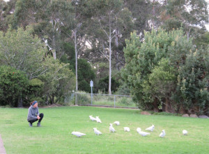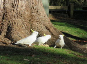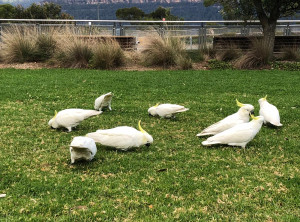 Auf der Wiese neben unserem Auto konnten wir einen Schwarm Kakadus beobachten. Sie spielten und hofften auf Snacks der vorbeikommenden Touristen.