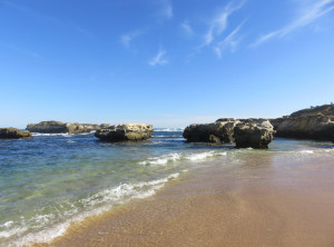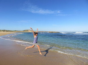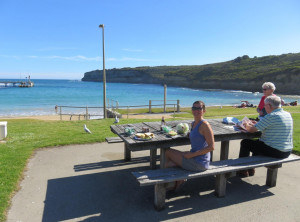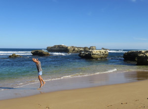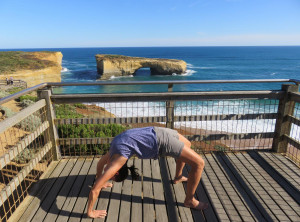 Wir passierten nochmals die völlig überlaufene Gegend um die 12 Apostel und steuerten das Küstenstädtchen Port Campbell an. An einer kleinen Bucht machten wir ein Picknick, Laufen macht schließlich hungrig. Gestärkt ging es nun zum Arch und zur London Bridge, einem weiteren Wahrzeichen der Great Ocean Road. Am nächsten Strand machten wir noch ein paar Hüpfbilder und sprangen dort auch direkt unter die öffentlichen Duschen. Perfekt, nun waren wir frisch geduscht, denn langsam wurde es für uns Zeit, die Küste zu verlassen. Für die Nacht hatten wir uns für einen kostenlosen Campingplatz im 25 km entfernten Ort Hawkesdale entschieden. Wir kamen vor dem Sonnenuntergang am Ziel für diesen Tag an, die Wiese zum Campen liegt dort neben dem Freibad, es gibt Picknickplätze, einen BBQ und die Toiletten und die Duschen des Freibades blieben auch nachts für die Camper auf, prima.