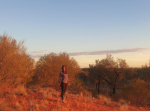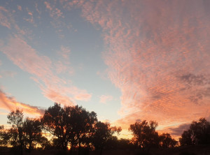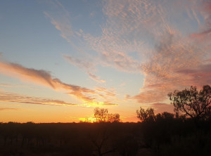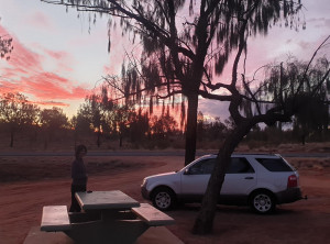 Wir übernachteten 100 Kilometer vor dem Kings Canyon, unserem nähsten Wanderziel auf einer kostenlosen Campingmöglichkeit. Wir hingen einfach mal etwas ab und genossen einen farbenfrohen Sonnenuntergang. Der Boden war steinig und in der Gegend gibt es Dingos, wir entschieden uns also im Auto zu übernachten und nicht das Zelt aufzuschlagen. Nachdem wir unser Nachtlager im Auto vorbereitet hatten, lud eine Australierin alle Camper ein, zu dem Lagerfeuer zu kommen, das sie und ihr Mann angezündet haben.