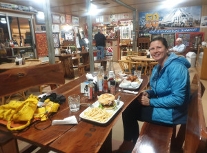 Abends gingen wir ins Roadhouse zum Essen. Da direkt nebenan eine Kamelfarm liegt, bestellte ich einen Kamelburger und Niko Hähnchen mit Gemüse. Der Burger war gut, das Hähnchen leider totfrittiert und das Gemüse aus der Dose. Das Roadhouse an sich war schon cool. Neben ein paar Gästen vom Campingplatz, vermuteten wir, dass auch noch ein paar Nachbarn zu Gast waren. Einige Gäste sahen zumindest so cowboymäßig aus, als ob sie hier wohnen würden. Auch der vermeintliche Besitzer des Ladens war ein richtiges Original. Passend zu seiner großen Schlumpfsammlung in einer Vitrine hatte er auf dem einen Oberarm Schlumpfine und auf dem anderen Papa Schlumpf tätowiert. Dazu trug er stilecht über seinem dicken Bauch ein ärmesloses Feinripp-Shirt. So ähnlich hatten wir es uns hier vorgestellt 😉 Wir hörten noch einige Bier-Schlager aus der Juke Box und kurze Zeit später hieß es für uns dann wieder Gute Nacht.