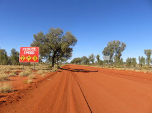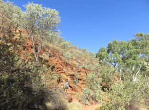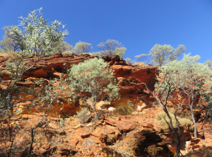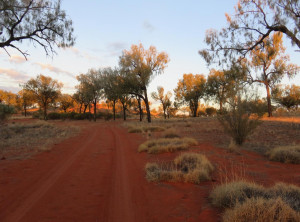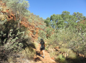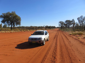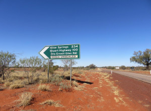 Am Auto angekommen, machten wir uns auf die Weiterfahrt nach Alice Springs. Es gab zwei Optionen: Einmal über den Larapinta Trail mit 150 Kilometer Schotterpiste mit großen Steinen oder die leichtere Variante über 100 Kilometer leichte Piste, für jedes Fahrzeug geeignet. Nachdem wir uns vor Ort nochmal informiert hatten, entschieden wir uns für die leichte Variante. Die steinige Piste wollten wir uns, unseren Reifen und unserem nur bedingt dafür geeigneten Auto Herrn Glück nicht zumuten.