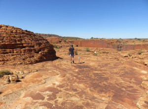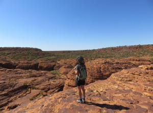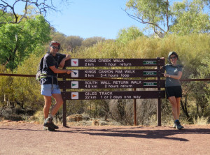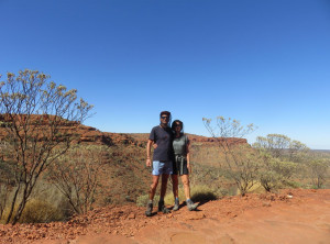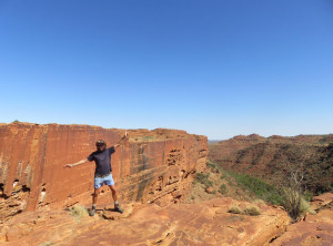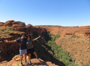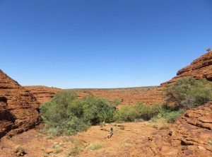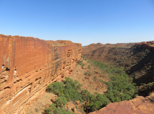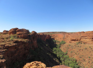 Am nächsten Morgen brachen wir früh zum Kings Canyon auf. Unser Frühstück mussten wir dort aufgrund hunderter Fliegen wieder im Auto einnehmen, bevor wir die Wanderung durch den Canyon antraten. Die Landschaft war wieder spektakulär. Der Schlucht hat sich mehrere hundert Meter tief ins Erdreich eingegraben. Die senkrechten roten Felswände gaben in Kombination mit dem tiefblauen Himmel und der grünen Vegatation unten im Tal ein sehr schönes Farbspiel ab. Wir waren mehr als beeindruckt von der Schönheit dieser Landschaft
