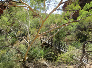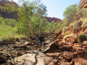 An einer Stelle, dem Garten Eden, gibt es ein Wasserloch und es wachsen sogar Palmen. Nach drei Stunden und acht Kilometern auf und ab bei herbstlichen 30 °C erreichten wir erschöpft wieder unser Auto. Der Weg war teilweise anstrengend und zum Nachmittag wurde es auf den roten Steinen sehr heiß. Wie muss das hier erst im Sommer sein…