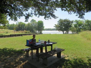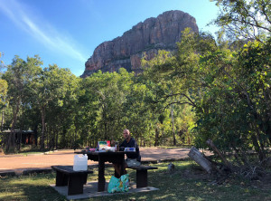 An einem schönen Picknickplatz am Fluss frühstückten wir, an allen Gewässern, die wir bis dahin passierten, wurde vor Krokodilen gewarnt, auch hier am Fluss. Wir befanden uns in der krokodilreichsten Region der Welt, also gaben wir Obacht und hielten uns nicht zu nah am Ufer auf. Die Sonne brannte und wir gerieten schon beim Frühstücken leicht ins Schwitzen.