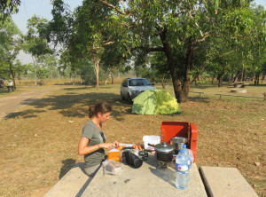 Wir fuhren zu einem Campingplatz im Park, bauten unser Zelt auf und machten bei den letzten Sonnenstrahlen unser Abendessen. Mit der Dunkelheit waren von einem Moment auf den anderen tausende Moskitos da. Uns blieb nichts anderes übrig, als unsere Sachen schnell einzupacken und den Rückzug ins Zelt anzutreten.