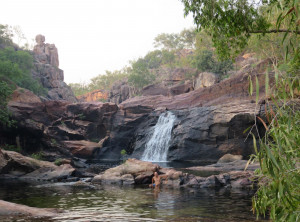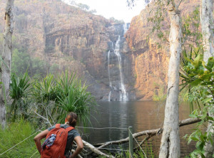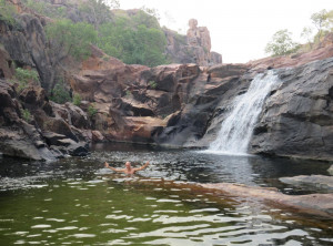Am Nachmittag wollten wir am „Yellow Water“ Billabong die Pflanzen und Tierwelt bestaunen. Leider war der Zugang nur mit einer geführten Tour möglich, schade. Im Nationalpark gibt es viele Regionen, die nur in der Trockenzeit besucht werden können, noch dazu braucht man am besten einen Geländewagen. Unsere Möglichkeiten waren somit begrenzt und unsere Zeit leider auch und damit blieben genügend Optionen. Wir entschieden uns dann spontan für einen Abstecher zu einem angepriesenen Wasserfall. Dorthin gelangt man über eine 40 km lange rote Schotterpiste, daher stand dieser Platz nicht ganz oben auf unserer Liste. Die Belohnung nach dieser Strecke ist ein schöner Campingplatz und ein zauberhafter Wasserfall mit einem großen Rock Pool, das hat sich mehr als gelohnt.