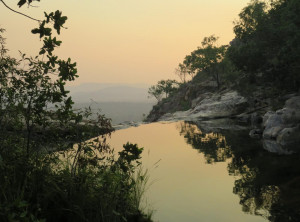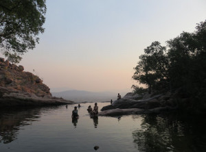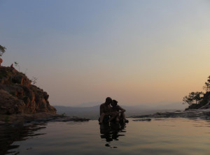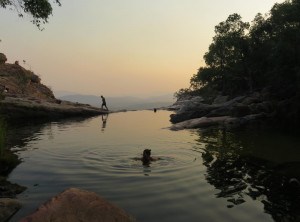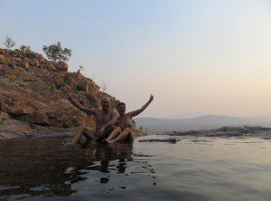 Wir bauten das Zelt auf und bereiteten das Abendessen zu. Mit gepackten Rucksäcken und Proviant ging’s los. Am Fuße des Wasserfalls wieder die Krokodilwarnung, ich traute mich nur zaghaft an den Uferstreifen. Wir begegneten zwei jungen Männern, die gerade ein Bad genommen hatten. Beide versicherten uns, es gibt höchstens “Freshies” und sie hatten nix gesehen. Wir wollten hier trotzdem nicht schwimmen. Wenige Minuten später trafen wir die zwei am Ufer wieder, wir vier beobachteten nun, wie ein ca. 2 m langes Frischwasserkrokodil im Wasser seine Runde drehte – nix wie weg.
