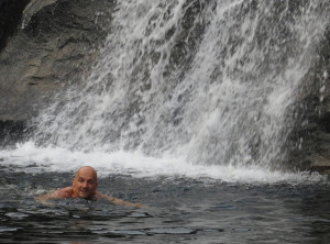 Eine halbe Stunde und etwa 100 Höhenmeter später standen wir oben am Wasserfall und hatten einen unglaublichen Blick auf die schöne Landschaft. Da im Umkreis einige kontrollierte Feuer brannten, war die Luft gespenstisch nebelig und irgendwie besonders. Was uns oben am Wasserfall erwartete, ist ein Traum. Ein Naturpool durch den das Wasser des Wasserfalls fließt mit einem unglaublichen Ausblick. So etwas Schönes kann nur die Natur bauen. Wir sprangen ins Wasser und genossen die Erfrischung und die Aussicht, hier oben gab es garantiert keine Krokodile.