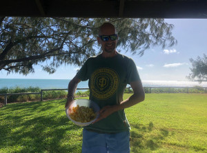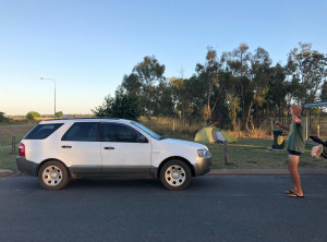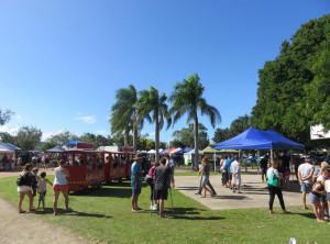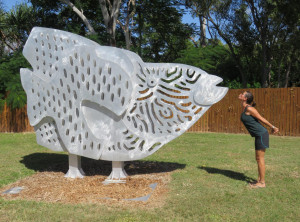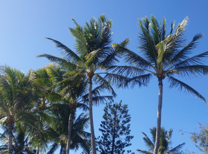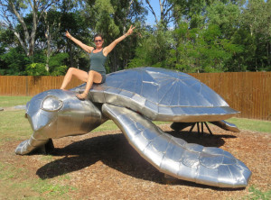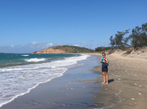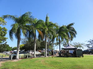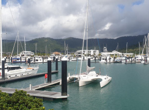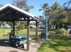 Wir übernachteten auf einem freien Campingplatz nahe am Highway, auf einer Wiese konnten wir sogar unser Zelt aufschlagen. Es gab ein sauberes Toilettenhäuschen und viele Picknickplätze. Ausserdem waren einige giftgrüne Frösche unterwegs. Am Morgen entdeckten wie einen Papayabaum auf unserer Wiese und pflückten uns eine Frucht. Wir fuhren weiter in den traumhaften Ort Bowen, joggten am Meer und frühstückten diesmal windgeschützt nahe am Wasser. Anschließend schlenderten wir noch über den Wochenmarkt. Hier kauften wir frische Ananas und eine Kokosnuss. Zwei Männer spazierten an uns vorbei und sprachen uns an. Warum wir ne Kokosnuss kaufen, die hängen doch überall an den Bäumen. Ja, stimmt…mal sehen. Schwimmen konnte man in Bowen nicht so gut, überall wurde vor Feuerquallen „Stingers“ gewarnt. Zum Baden fuhren wir deshalb nach Airlie Beach, denn dort gibt es einen mit einem Netz abgetrennten Schwimmbereich im Meer. Airlie ist ein schönes, etwas protziges Städtchen mit einigen Yachten im Hafen, Clubs, Bars und Shops. Hier könnte man es sich mit dem entsprechenden Kleingeld gemütlich machen. Wir schwammen im Meer, aßen Fish & Chips und machten uns vom Acker…
