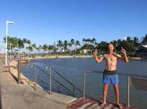 Nach etwa 4 Stunden waren wir zurück am Auto und fuhren zurück in die City. Da auch hier vor der Küste Krokodile unterwegs sind und zudem noch einige gefährliche Feuerquallen im Wasser schwimmen, ist es gesünder nicht zu baden. Die Stadt hat Abhilfe geschaffen und einen schönen gratis Naturpool mit Meerblick gebaut, da schwammen wir ein paar Runden.