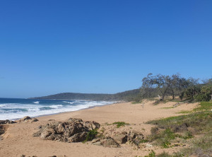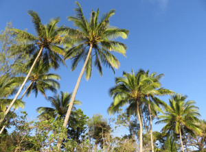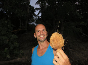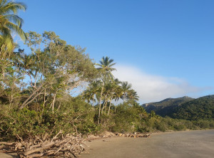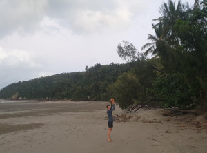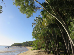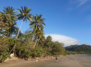 Am späten Nachmittag kamen wir an unserem Tagesziel, dem Campingplatz am Cape Hillsborough an. Obwohl es bewölkt war, waren wir beide von der Schönheit dieses Ortes begeistert. Unabhängig voneinander kamen Erinnerungen an den Paradise Beach im Süden Myanmars hoch. Direkt hinter dem breiten von Kokospalmen gesäumten Sandstrand lag unser Campingplatz. Nachdem das Zelt stand, gingen wir in der Abenddämmerung an den Strand. Dort suchten wir Kokosnüsse unter den Palmen und fanden vier Stück. Wir wollten mit diesen Früchten am nächsten Morgen unser Frühstück aufpeppen. Kokos passt doch perfekt zu den frischen Ananas, die wir in Bowen auf dem Markt gekauft haben. Es war sehr schön, beim Einschlafen im Zelt mal wieder die Brandung zu hören. Das hatten wir lange nicht mehr.
