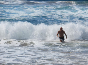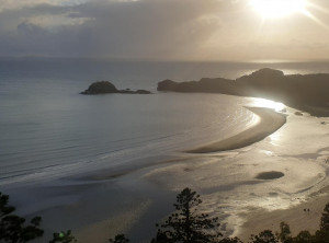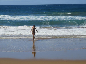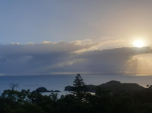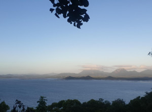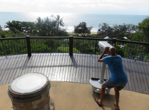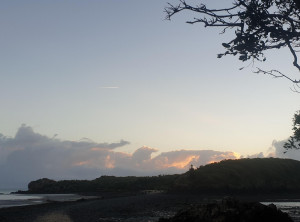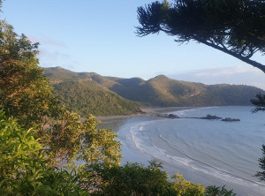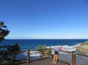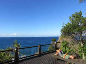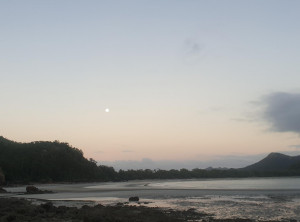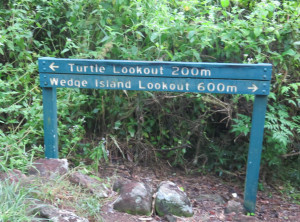 Wir gingen den Strand entlang zu der Insel, aber vom Sonnenaufgang sahen wir wegen ein paar Wolken leider nichts. Das waren vermutlich die Überreste des Regens, der in der Nacht niedergegangen ist. Weiter ging es über 3 Aussichtspunkte zurück durch den subtropischen Regenwald zum Campingplatz und endlich zeigte sich die Sonne. Am Turtles Lookout sieht man aus der Ferne oft Schildkröten, die im Wasser Seegras weiden, leider nicht an diesem Morgen.