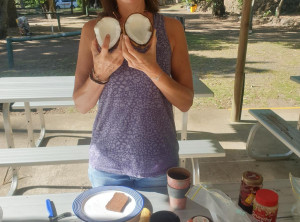 Zurück am Campingplatz bereiteten wir unser Frühstück zu und versuchten mit einem Messer und Hammer, die Kokosnüsse zu knacken. Das gelang uns auch mit einiger Anstrenung, eine der Frückte war frisch und schmeckte hervorragend. Die anderen drei waren leider nicht mehr frisch oder hatten bereits ein Leck. Nach diesem super Frühstück machten wir uns auf den Weg nach Agnes Water, dem nächsten Ziel unserer Reise.