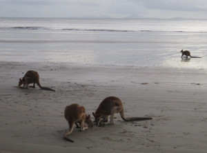 Am nächsten Morgen standen wir vor dem Sonnenaufgang auf. An der Rezeption wurde uns dieses empfohlen, da morgens Kängurus am Strand seien und man wegen Ebbe zu Fuß auf eine kleine Insel vor der Küste gelangen kann. Also gingen wir um 6 Uhr zum Strand. Dort waren schon einige Zuschauer, die wie wir auf dem Campingplatz übernachteten und eine Biologin vom Nationalpark, die die Kängurus artgerecht fütterte. Sie bekamen etwas für ihre Verdauung, da sie oft von Menschen gefüttert werden, aber unser Essen eigentlich nicht vertragen. Für die Kängurus ist es eher schädlich als gut, wenn sie zum Beispiel Gurken oder Tomate essen.