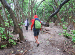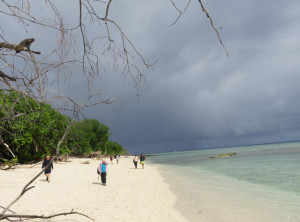 Kurz bevor wir an der Insel ankamen, zog eine dicke Regenwolke über die Insel und wir fuhren direkt rein. Es flüchteten alle vom Außendeck. Wir warteten den Regen ab und bestiegen dann ein kleineres Boot mit Glasboden, welches in der Bucht lag und uns an den Strand der Insel brachte. Das Meer schimmerte trotz Regenwolke türkisblau und das Wasser war kristallklar. Der erste Programmpunkt war ein Ausflug auf die Insel. Wir wurden einmal ordentlich nass, zum Glück war es warm und wir trockneten auch schnell wieder. Im Glasbodenboot durften wir einen ersten Eindruck der atemberaubende Natur unter Wasser erhaschen.