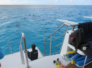 Zurück auf dem Schiff gab es ein köstliches Buffet mit Meeresfrüchten und vielen frischen Salaten. Wir genossen das Mittagsmenu und machten uns bereit zum Schnorcheln, unserem Highlight dieser Tour. Das Wasser hatte eine Temperatur von 23 Grad, also etwas frisch war es schon, ABER die vielen bunten Fische und die Schildkröten, die neben uns auf auftauchten, um Luft zu schnappen, entschädigten uns sofort. Wir sind direkt neben diesen für uns riesigen Schildkröten geschwommen. Es ist unbeschreiblich, was für eine Welt sich da unter Wasser offenbart, durch dem weißen Sand am Meeresboden schimmert der Ozean türkisblau und mit Hilfe der Sonne war die Farbenpracht der Fische und Korallen famos.