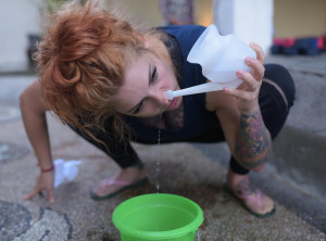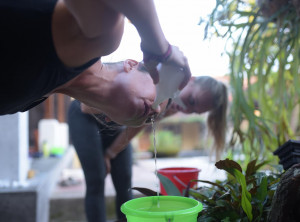 Zu unserer Yoga Praxis gehörten auch Reinigungsrituale. Jeden Morgen spülten wir unsere Nase mit Salzwasser, so konnten wir bei den Atemübungen gut durch die Nase Luft holen. An einem Samstag haben wir jede Menge Salzwasser getrunken und dann wieder ausgespuckt, um den Magen zu reinigen. An einem anderen Samstag war der Darm dran, diesmal mit noch mehr Salzwasser und einem Tänzchen, welches das Wasser im Körper so richtig in Wallungen brachte. Auch dies gehörte dazu und es war eine spannende Erfahrung. Nach diesem Ritual durften wir uns zurückziehen. Wir hatten uns entschieden, an diesem Tag zu schweigen, so hatte jeder mal Zeit für sich.