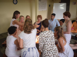 Wir 8 verbrachten nun also die nächsten vier sehr intensiven Wochen gemeinsam. Morgens um 6:00 trafen wir uns zum Unterricht. Wir nahmen gemeinsam drei vegetarische Mahlzeiten am Tag ein, teilten unser Wissen, unsere Sorgen und unsere Fragen. Begleitet wurden wir stets vom Lehrerteam.