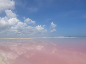 Am nächsten morgen geht es zu den Flamingos. Wir fahren mit dem Auto bis Los Colorados. Tourguides erwarten uns hier und wollen uns die Salzseen und die Flamingos zeigen. Es geht hier nicht ohne Guide weiter, da es sich um Privatgelände der Salzindustrie handelt. Hier arbeiten übrigens mehr als 400 Menschen an der Salzproduktion. Mit dem Guide geht es zu den pinken Seen. Je nach Salzgehalt verändern sich die Farbtöne des Wassers. Wir machen außergewöhnliche Fotos aus unterschiedlichen Perspektiven. Erste Flamingos sind auch schon zu sehen. Nächster Stopp ist ein kleiner Tümpel hinter den Dünen. Dort gibt es kleine Fische, die uns die Haut an den Füßen anknabbern und verjüngen. Dies kostet in Cancun 20 Euro extra. Und weiter geht es zu unserem Highlight. Der Verjüngungskur. Wir reiben uns mit Salzschlamm ein, 10 Minuten auf der Haut trocknen lassen und im Meer abspülen. Dadurch bekommt man eine absolute Babyhaut. Lustig aber leider nur von kurzer Dauer.