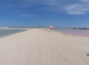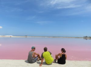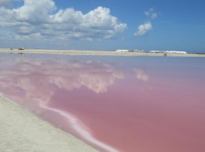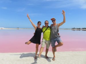 Am nächsten morgen geht es zu den Flamingos. Wir fahren mit dem Auto bis Los Colorados. Tourguides erwarten uns hier und wollen uns die Salzseen und die Flamingos zeigen. Es geht hier nicht ohne Guide weiter, da es sich um Privatgelände der Salzindustrie handelt. Hier arbeiten übrigens mehr als 400 Menschen an der Salzproduktion. Mit dem Guide geht es zu den pinken Seen. Je nach Salzgehalt verändern sich die Farbtöne des Wassers. Wir machen außergewöhnliche Fotos aus unterschiedlichen Perspektiven. Erste Flamingos sind auch schon zu sehen. Nächster Stopp ist ein kleiner Tümpel hinter den Dünen. Dort gibt es kleine Fische, die uns die Haut an den Füßen anknabbern und verjüngen. Dies kostet in Cancun 20 Euro extra. Und weiter geht es zu unserem Highlight. Der Verjüngungskur. Wir reiben uns mit Salzschlamm ein, 10 Minuten auf der Haut trocknen lassen und im Meer abspülen. Dadurch bekommt man eine absolute Babyhaut. Lustig aber leider nur von kurzer Dauer.