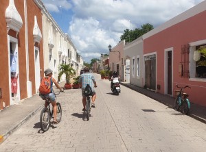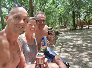 Umgeben von ein paar Fischen hockten wir gemeinsam mit anderen Besuchern im kühlen Nass der Grotte. Wir schwammen etwas umher und genossen das erfrischende Wasser, ein paar Lichtstrahlen fallen durch ein Loch In der Höhlendecke ein, so das wir genug sehen konnten. Nach einer Weile stiegen wir wieder ans Tageslicht und spazierten über die Straße zur nächsten Cenote. Hier war es etwas voller und ebenfalls sehr schön – also wieder rein ins kühle Nass. Puh nach der zweiten Grotte gab es erstmal ein Geburtstagsbier, bevor wir uns auf die Räder schwangen, um die nächste ca 6 km entfernte Cenote anzusteuern.