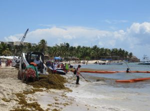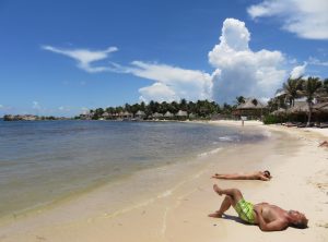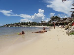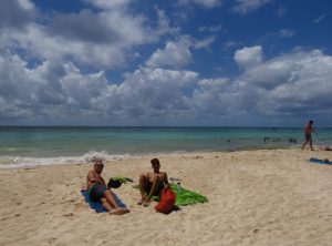 Nach dem Frühstück starteten wir mit geliehenen Fahrrädern zum etwa 7 km entfernten Strand. Es war schon fast Mittag und unglaublich warm. An der schönen Küste reiht sich Hotel an Hotel und der Zugang zum Strand war schwerlich möglich. Wir wollten keinen Mindestverzehr von 1000 Pesos (46 €) für den Sprung ins Meer investieren. Ein Stück weiter hinten gab es einen kleinen Streifen Strand, der öffentlichen zugänglich ist und an dem nur wenige Algen zu sehen waren. Wir sprangen ins kühle Nass und erholten uns dort eine Weile von der Radtour. Bevor wir den Rückweg antraten, setzten wir uns noch in eine Bar und beobachteten in erster Reihe das Treiben auf der Calle.