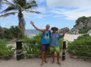 Nun aber erstmal nach Tulum. In einem spartanisch eingerichteten Hostel bezogen wir zu dritt ein Zimmer für vier. Nach einer Siesta spazierten wir durch die City. Wir trafen zufällig Emelie unsere Kölnerin aus Cancun wieder und sahen später eine holländische Familie, die wir von der Autovermietung ebenfalls aus Cancun kannten. Die Welt ist gar nicht so groß. Wir schauten uns etwas um, bummelten durch die Shops und speisten in einem Vegetarischen Restaurant. Die Nacht in unserem Hostel war etwas unruhig, da wir gegenüber vom Busbahnhof wohnten und ständig das Piepen der zurück setzenden Busse hörten, aber was soll’s.
