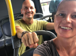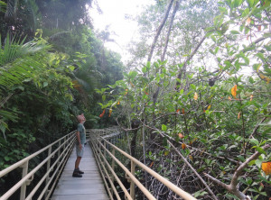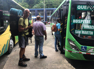 Der Fernbus stoppte leider nicht in Quepos und wir mussten zunächst 4 Kilometer mit einem anderen Bus an die Hauptstraße zur Haltestelle fahren. Es fing an zu regnen und wir quetschten uns mit 2 Frauen mit Kindern unter den winzigen Unterstand. Der Regen wurde immer heftiger, von Blitz und Donner begleitet und es kam auch etwas Wind auf. Trotz Schirm und Unterstand wurden wir und Teile unseres Gepäcks ziemlich nass, So saßen wir dort etwa eine Stunde im prasselnden Regen, bis der Fernbus endlich kam. Auf geht es nach Panamá!