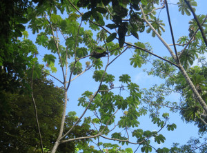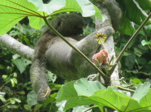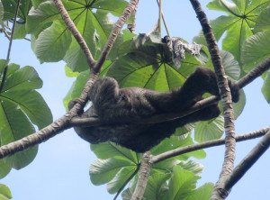 Am nächsten Morgen ging es früh mit dem Bus zum Nationalpark. Und kaum zu glauben aber wahr, zum ersten Mal in Costa Rica zeigte sich die Sonne! Das kleine Schutzgebiet ist sehr beliebt und daher standen wir schon um 6:45 Uhr vor den noch geschlossenen Toren. Wir waren die ersten in der Reihe von etwa 20 Touristen und um Punkt 7 Uhr durften wir rein. Los ging es, wir spähten in die Baumkronen und tatsächlich sahen wir schon nach etwa 500 Metern in einem Baum hoch über uns ein erstes Faultier, das seinem Namen alle Ehre machte und einfach nur regungslos herumlag.
