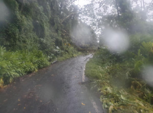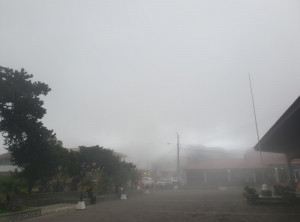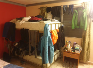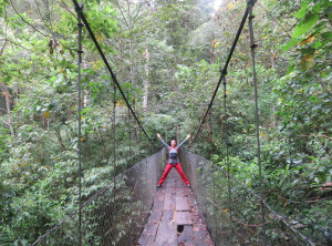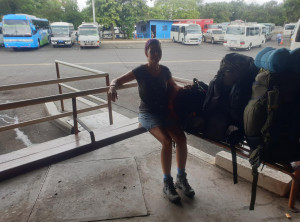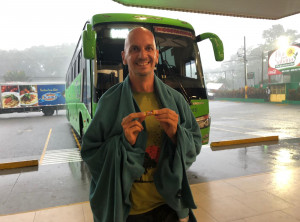 Als wir endlich an der Straße ankamen, an welcher die Sammeltaxis halten, entschieden wir uns, nicht stehen zu bleiben. So nass wird es dann doch irgendwann frisch und wir liefen dem Taxi entgegen. Nach etwa einem Kilometer auf der Straße und vielen Kurven versperrte ein wirklich großer Baum den Weg. Hier muss wohl ein Blitz eingeschlagen haben, jedenfalls kein Durchkommen für Fahrzeuge. Wir kletterten über den Baum, was sich auch als Herausforderung rausstellte bei dem ganzen Gestrüpp. Weiter ging’s und zu unserer großen Erleichterung trafen wir nach der nächsten Kurve auf das Sammeltaxi, welches uns ins trockene Hotel brachte. In unserem Zimmer stand neben unserem Bett noch ein Etagenbett, zum Glück – denn so konnten wir daran gut unsere triefnassen Klamotten aufhängen .
