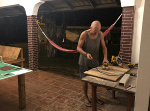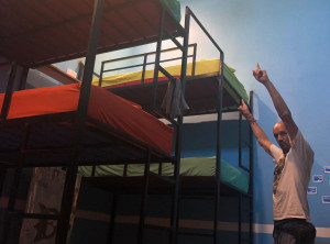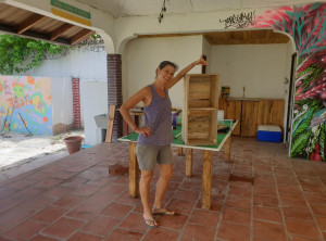 Am nächsten Tag startete unsere erste Schicht. Für Kost & Logis halfen wir sechs Tage in der Woche fünf Stunden pro Tag mit. In der ersten Woche machten wir die Spätschicht ab 15 Uhr und in der Folgewoche die Frühschicht ab 9 Uhr. Neben den üblichen Dingen des Tagesgeschäfts wie Putzen und Betten beziehen, verschönerten wir auch einige Dinge im Hostel. Niko gestaltete zum Beispiel den großen Aufenthaltsraum, die „Disko“ des Hostels um oder sorgte dafür, dass immer frische Blumen auf den Tischen standen. Zusammen schreinerten wir aus Holzresten zwei Beistelltische für ein neues Zimmer und ich fertigte Türen für die Schränke in der großen Küche an.
