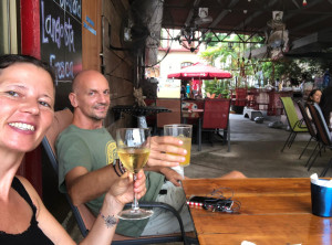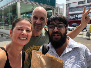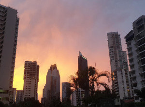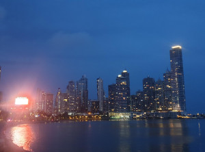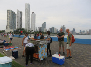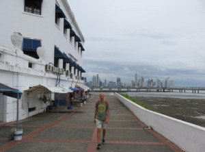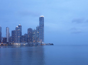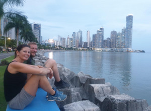 Am späten Nachmittag wechselten wir in ein Restaurant, wo wir André aus Köln wieder trafen. Wir kannten ihn schon aus Farallon und in Panama hatten wir ins selbe Hostel eingecheckt. Nach zwei Bierchen entschieden wir uns vor Einbruch der Dunkelheit die 6 km zum Hotel am Meer entlang zu laufen. Der Weg war richtig schön, er führte uns vorbei am Fischmarkt entlang der Promenade mit Blick auf die Skyline. Am Wasser machten wir noch eine kleine Pause und beobachteten, wie die Lichter der Stadt an und die Sonne unter ging.