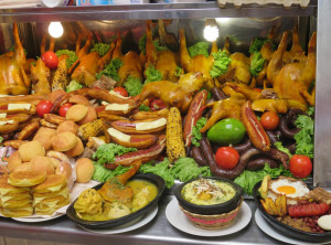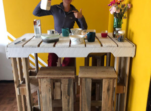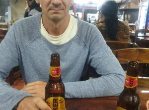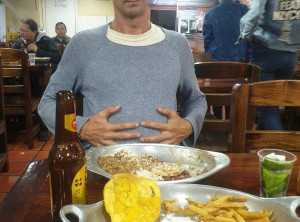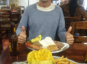 Am nächsten Tag unternahmen wir nicht viel. Wir versuchten, etwas zu joggen, aber die Gegend war dafür leider nicht geeignet. Auf dem Bürgersteig einer vielbefahrenen Straße macht es keinen Spaß und es gab weit und breit keine Grünanlage. Also schauten wir uns etwas in unserem Viertel Chapinero um. Wir entdeckten einige schöne Straßen mit netten Restaurants und testeten in einem Café eine heiße Schokolade mit Käse. Ja mit Käse, diese Spezialität hatte uns unser Gude der Radtour empfohlen, unser Fazit – kann man mal probieren. Abends gingen wir in einem kolumbianischen Restaurant essen, Wir tranken ein Bier der Brauerei Poker und machten entsprechend dazu ein Pokerface. Niko bestellte Fisch und ich auf Empfehlung unseres Gastgebers Jean Bandeja Paisa. Wir wussten nicht, was es ist, aber schon bald wurden die riesigen Portionen an unseren Tisch gebracht. Die Bandeja Paisa war ein riesiger gemischter Teller mit unterschiedlichen Fleischsorten, Reis und Bohnen, sehr deftig und sehr lecker. Da es unmöglich war, die Portionen komplett zu essen, ließen wir uns die Reste für den nächsten Tag einpacken.
