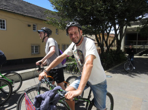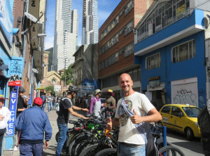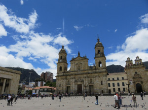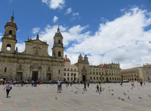 Am nächsten Morgen kauften wir zunächst ein. In der Nähe der Unterkunft liegt eine Einkaufsstraße mit vielen Geschäften. Hier probierten wir auch die ersten kolumbianischen Spezialitäten, Papas Rellenas. Das sind runde tenisball große Bällchen, gebacken aus Kartoffelbrei und gefüllt mit einem hartgekochten Ei und Reis, sehr lecker und mit umgerechnet 0,60 € wird man sehr günstig satt. Vormittags nahmen wir einen Bus Richtung La Candelaria, so heißt die Altstadt Bogotas. Wir besuchten den Hauptplatz der Stadt mit der Kathedrale, den Plaza de Bolivár, und schlenderten ein wenig durch die Gassen, bevor wir am Nachmittag an einer geführten Radtour durch die Stadt teilnahmen. In Bogotá gibt es sehr viele Radwege und es ist die fahrradfreundlichste Stadt Lateinamerikas. Trotzdem war es eine Herausforderung für unseren Guide uns durch die Menschen- und Automassen zu navigieren. Auf der Tour machten wir an vielen nicht unbedingt typisch touristischen Stationen halt. An einigen Orten erzählte unser Guide etwas zur sehr von Gewalt und Bürgerkrieg geprägten Vergangenheit Kolumbiens. Seit einigen Jahren gibt es Hoffnung, da die verfeindeten Parteien Frieden geschlossen hatten. Dieser ist aber immer noch sehr fragil, in der Vorwoche unserer Ankunft hatten 5 der 10 Abgeordneten der ehemaligen Rebellen das Parlament verlassen und den Frieden für beendet erklärt. Hoffen wir, dass es in Kolumbien trotzdem friedlich bleibt.