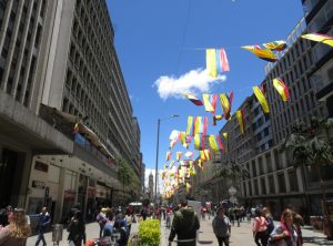 Am nächsten Morgen kauften wir zunächst ein. In der Nähe der Unterkunft liegt eine Einkaufsstraße mit vielen Geschäften. Hier probierten wir auch die ersten kolumbianischen Spezialitäten, Papas Rellenas. Das sind runde tenisball große Bällchen, gebacken aus Kartoffelbrei und gefüllt mit einem hartgekochten Ei und Reis, sehr lecker und mit umgerechnet 0,60 € wird man sehr günstig satt. Vormittags nahmen wir einen Bus Richtung La Candelaria, so heißt die Altstadt Bogotas. Wir besuchten den Hauptplatz der Stadt mit der Kathedrale, den Plaza de Bolivár, und schlenderten ein wenig durch die Gassen, bevor wir am Nachmittag an einer geführten Radtour durch die Stadt teilnahmen. In Bogotá gibt es sehr viele Radwege und es ist die fahrradfreundlichste Stadt Lateinamerikas. Trotzdem war es eine Herausforderung für unseren Guide uns durch die Menschen- und Automassen zu navigieren. Auf der Tour machten wir an vielen nicht unbedingt typisch touristischen Stationen halt. An einigen Orten erzählte unser Guide etwas zur sehr von Gewalt und Bürgerkrieg geprägten Vergangenheit Kolumbiens. Seit einigen Jahren gibt es Hoffnung, da die verfeindeten Parteien Frieden geschlossen hatten. Dieser ist aber immer noch sehr fragil, in der Vorwoche unserer Ankunft hatten 5 der 10 Abgeordneten der ehemaligen Rebellen das Parlament verlassen und den Frieden für beendet erklärt. Hoffen wir, dass es in Kolumbien trotzdem friedlich bleibt.