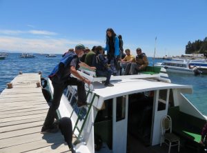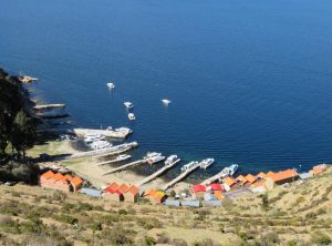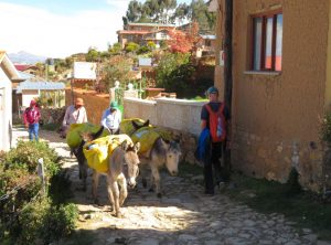 Am nächsten Vormittag kauften wir auf dem lokalen Markt Vorräte für die nächsten Tage ein. Für den Nachmittag hatten wir eine Bootsfahrt zur Isla del Sol gebucht, der größten Insel im Titicacasee. Nach ca. 2 Stunden auf dem Wasser kamen wir dort an und hatten 90 Minuten Zeit, dem Südteil der Insel zu erkunden. Wir gingen über einen Berg zu dem Hauptort der Insel, wo wir wieder eingesammelt werden sollten. Tief unter uns schimmerte der See in der Sonne und weit entfernt am anderen Ufer sahen wir eine schneebedeckte Bergkette. Autos gibt es hier nicht und alles wirkte sehr beschaulich.