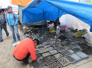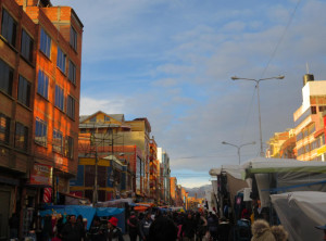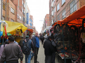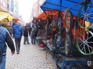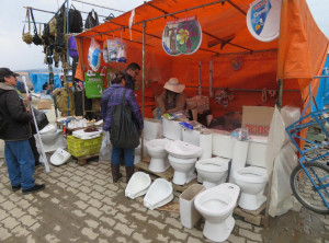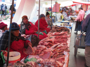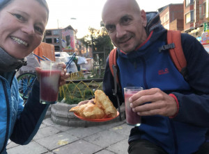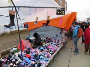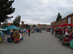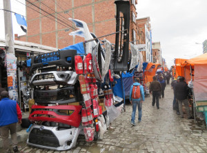 Schon auf dem Hinweg hatten wir – leider im Regen- von oben kilometerlang Marktstände gesehen. Diesmal stiegen wir etwas früher aus, es war zwar kalt aber trocken und wir schlenderten noch über den Markt von El Alto, der jeden Donnerstag und Sonntag abgehalten wird. Es handelt sich hierbei wohl um den größten Markt Südamerikas und wir staunten nicht schlecht. Wir haben ja auf unserer Reise schon einiges gesehen und viele Märkte besucht. Dieser Markt war gigantisch und es gab ALLES wirklich ALLES. Lebensmittel, Möbel, Haustüren, Autozubehör, Lampen, Schrauben, Kleidung, warme Decken und und und… Außerdem gab es noch lauter Köstlichkeiten für wirklich kleines Geld. Wir spazierten also umher probierten hier und da etwas Leckeres, kauften Teflonband, Gemüse und Gewürze, ein Armband, frisch gepressten Orangensaft und staunten immer wieder über die Vielfalt. Der Himmel klarte auch etwas auf und wir hatten on top noch einen schönen Blick auf schneebedeckte Berge. Mit dem Sonnenuntergang machten wir uns auf den Heimweg zu Jeff auf unseren bewachten Parkplatz.