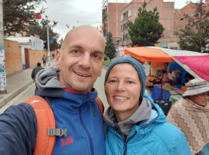 Als nächstes kauften wir ein paar Lebensmittel für die nächsten Wandertage. Wir planten eine zweitägige Tour mit unserem Zelt den Camino el Choro. Der Startpunkt liegt hoch oben auf 4600 Metern. Nach unseren Erledigungen machten wir uns wieder auf den Weg durch die Stadt immer weiter aufwärts zum Pass. Am Stadtrand aßen wir noch ein spätes Mittagessen und gegen 17 Uhr erreichten wir den Parkplatz und auch gleichzeitig unseren Schlafplatz. Wir wollten noch eine Runde an die frische Luft, aber es zog eine dunkle Nebelwolke auf, es war kalt und windig hier oben auf 4600 Metern. So machten wir es uns im Auto gemütlich, packten unsere Rucksäcke und freuten uns auf den kommenden Wandertag.
