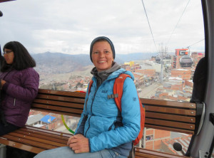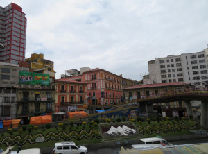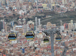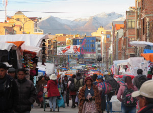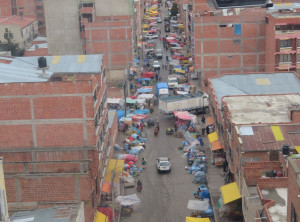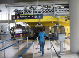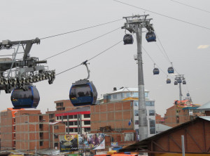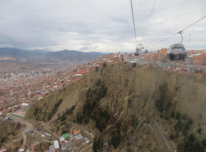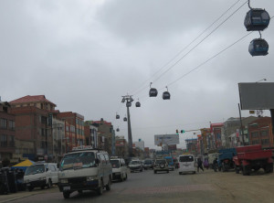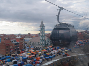 Auf dem lokalen Markt, der direkt neben unserem Auto aufgebaut war, kauften wir eher aus Verlegenheit ein paar Kleinigkeiten und machten uns bald auf den Weg nach La Paz. Die Stadt mit 1,2 Millionen Einwohner liegt auf 3700 Metern Höhe und ist die zweitgrößte Stadt des Landes. Wir hatten uns einen bewachten Parkplatz neben der Uni am Rande der Stadt rausgesucht, den wir als erstes ansteuerten. Der Parkplatz war nicht hübsch, aber von einer sicheren Mauer umzogen, bewacht, mit WC und kostete für 24 h umgerechnet nur 1,56 €. Wir parkten ein und machten uns auf den Weg zur Bahnstation. La Paz ist sehr bergig und seit ein paar Jahren ist ein Seilbahnnetz, welches eine Firma aus Österreich gebaut hat, das Fortbewegungsmittel der 1. Wahl. Man ist schnell und hat eine gute Aussicht über die Stadt.