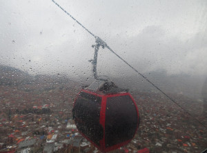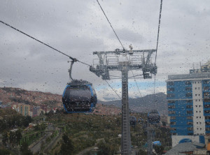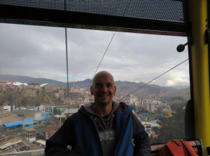 Das Wetter wurde etwas besser und wir traten unsere Rundreise über die Stadt mit vier der verschiedenfarbigen Seilbahnen an. Die letzte brachte uns hoch hinauf mit super Aussicht. Quasi beim Umsteigen genehmigten wir uns noch einen Kaffee und weiter ging die Reise zurück zu unserem Startpunkt nach El Alto.