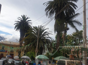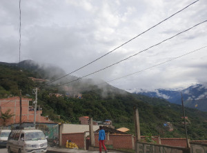 Wir fuhren zunächst im Nebel und Schneetreiben immer weiter runter. Der Schnee ging rasch in starken Regen über und das Thermometer im Auto zeigte Plusgrade an. Wir fuhren eine Ewigkeit steil den Berg hinunter bis das Wetter endlich besser wurde. Die karge Gebirgslandschaft wich saftig grüner Vegetation und kurz vor Coroico wuchsen die ersten Bananenpalmen. Total verrückt, vor 2 Stunden noch im Schnee und jetzt in den Tropen. Coroico liegt sehr schön hoch über einem Tal. Als erstes fuhren wir zu unserer Unterkunft und konnten zum Glück problemlos einen Tag eher als geplant einchecken. Wie der Zufall es so will, gehörte die Unterkunft einer Bolivianerin aus La Paz und einem deutschsprachigen Schweizer. Die zwei haben hier schon vor 15 Jahren ihren Lebenstraum verwirklicht. Der Schweitzer berichtete uns ein paar Details zu der bevorstehenden Wahl und der politischen Situation im Land, welche sehr gespalten ist. Der Westteil Boliviens hält zum Amtsinhaber Morales, der seine Macht nicht so recht abgeben möchte. In Ostbolivien sympatisieren die Menschen eher mit dem Gegenkandidat Mesa. Am Nachmittag erkundeten wir noch etwas den Ort, aber leider fing es wieder an zu regnen und wir gingen zurück zur Unterkunft und genossen es mal nix zu tun.