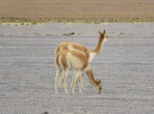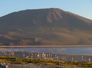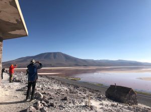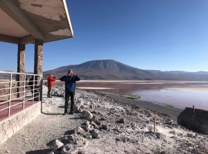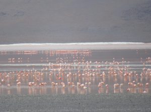 Wir genossen die schöne Landschaft, passierten einen Salzsee und beobachteten immer wieder Vicunjas, die seltene Kamelart, die in den Anden lebt. Ab und zu sahen wir einen Jeep, der Touristen chauffierte. Gegen 16 Uhr erreichten wir unser Ziel, schon von weitem schimmerte die Laguna Colorada rosa, dies lag nicht zuletzt an den 1000den Flamingos, die sich im Wasser tummelten. Noch um eine lang gezogenen Kurve und wir erreichten den Parkplatz. Tatsächlich ergatterten wir die letzte Parkbucht. Hier standen bestimmt 40 Jeeps, die jeweils zwischen 2 und 6 Touristen an Bord hatten. Es war also voll und an dieser Seite der Lagune hatten sich die vielen Vogel etwas Richtung Mitte des Gewässers zurück gezogen. Wir spazierten eine Runde zwischen den Touristen umher und genossen die Kulisse. Wir freuten uns aber auch darauf, dass die Touren dann auch bald wieder aufbrechen und warteten erstmal ab. Etwa eine Stunde später hatten wir die Lagune für uns. Wir machten dieselbe Runde nochmals, viel besser!