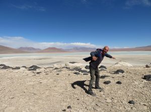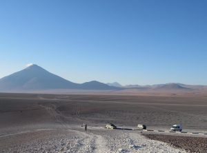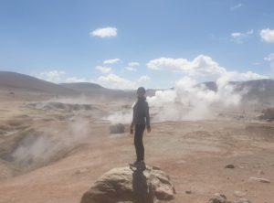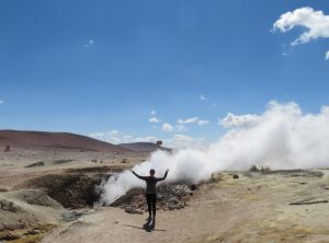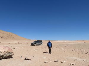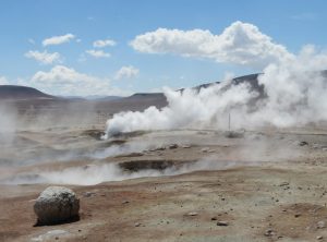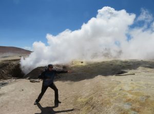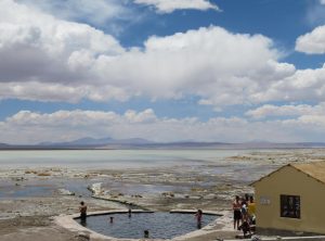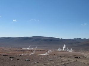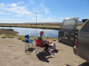 Los ging es nur 30 km und eine Stunde Fahrzeit entfernt liegt die nächste Attraktion, Geysire! Die Erde brodelte, es dampfte und zischte. Wir schlugen erstmal etwas entfernt unser Lager auf und frühstückten – mit Aussicht. Anschließend schauten wir uns noch etwas um und setzten bald unsere Fahrt fort. Die Wege waren weiterhin schlecht, Sand, Geröll und Steine wechselten sich ab. Zum Glück war es zum nächsten Stop auch nicht weit. Eine heisse Quelle mit Blick auf Flamingos. Toll, so ein Bad hatten wir auch dringend nötig. Wir genossen das warme Wasser und quatschten etwas mit anderen Touristen. Drei Studenten aus Santiago erzählten etwas über die aktuelle politische situation und wie sie die Lage einschätzen. Frisch gebadet ging es weiter. Wir freuten uns gerade, dass wir so gut im Plan liegen und berieten uns bezüglich der Wanderung für den nächsten Tag, als Jeff aufpiepste – wir sollten den Reifendruck prüfen. Na gut – während Markus mir unserem in Peru gekauften Messgerät die Reifen rechts prüfte lief ich ums Auto. Der Reifen vorne links zischte unüberhörbar. Es musste auch nicht mehr gemessen werden, innerhalb von Minuten war der Reifen platt wie ne Flunder.