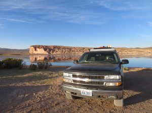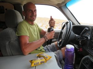 Gemeinsam schafften wir es relativ schnell Jeffrey aufzubocken und den Reifen zu wechseln. Yehaaa!!! Während Markus, Attilio und ich abwechselnd über dem Handbuch, im Staub und am Reifen hantierten, verschwand Jolie im Van und überraschte uns nach getaner Arbeit mit Pasta. Mit einer guten Flasche Wein aus Peru machten wir uns es nun also zu viert im Van gemütlich. Die zwei haben die kopierte Innenausstattung selber gemacht und leben mit einem gemütlichen Hochbett einer IKEA Küche und einer sitzecke recht luxuriös auf vier Rädern.