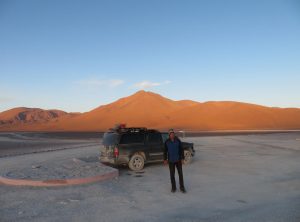 Am nächsten Morgen stellten wir uns den Wecker, um den Sonnenaufgang zu sehen. Mit einem wärmenden Kaffe in der Hand genossen wir die Stille der Natur. In der Nacht war es kalt und windig gewesen und die Temperaturen um den Gefrierpunk. Es dauerte nicht lange und der erste Jeep beladen mit freundlichen Asiaten tauchte in der Idylle auf. Wir beschlossen, bald die Kurve zu kratzen. Auf dem Weg zum Auto trafen wir noch Attilio, er hatte am Vortag Probleme mit drm Auspuff an seinem Fahrzeug hat aber zum Glück alles alleine wieder befestigen können.
