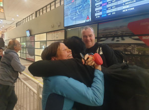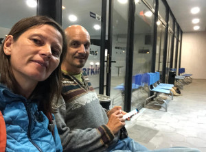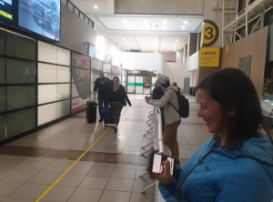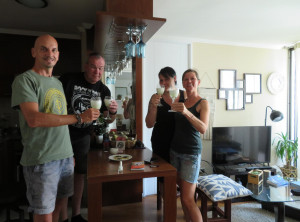 Der Flieger von Kerstin und Olli aus Buenos Aires war für 2 Uhr nachts angemeldet, besonders ich war den ganzen Tag schon aufgedreht vor lauter Vorfreude, an schlafen war jedenfalls Vorher nicht zu denken. Wir fuhren zeitig los und stellten unseren Jeffrey in der Nähe des Flughafens auf einen bewachten Parkplatz, dort sollte er die nächsten drei Nächte auch bleiben. Jetzt hieß es warten, warten und warten… leider hatte die Maschine auch noch Verspätung. Um fast 3 Uhr war es dann soweit, die zwei spazierten durch die Sicherheitskontrolle. Was für eine Freude! Noch schnell den Mietwagen abgeholt, in dem wir zu viert Platz hatten und auf zu unserem Appartement in die City. Irgendwie waren wir alle auf einmal nicht mehr müde. Wir machten uns einen leckeren chilenischen Wein auf und quatschten bis zum Morgengrauen. Mit einer ganzen Palette an Mitbringseln zauberte Kerstin etwas heimatliche Atmosphäre in die Bude: Altbier, Lebkuchen, Dominosteine, Gummibärchen, Glühfix und und und zauberte sie aus ihrem Koffer hervor. Es gab Wein und Plätzchen aus Argentinien und unsere bestellten Laufschuhe, sogar für Jeffrey war ein Aufkleber dabei- 95 Olé!