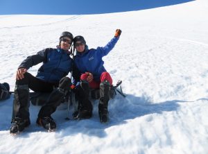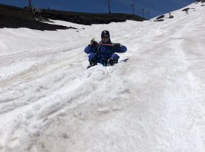 Rauf war ja schon steil, aber wie soll man hier nur wieder heile runter kommen?! Wir schaffen es mit Mühe bis zu den Rucksäcken. An dieser Stelle zogen wir unsere Schneehose an spannten uns noch ein Leder unter den Po und ab ging die Post. Auf dem Hosenboden rutschten wir den Hang runter, der Eispickel durfte bei Bedarf als Bremse in den Schnee gerammt werden. Markus hatte großen Spaß, ich hatte große Angst. Nach der Hälfte der Rutschpartie wurde es auch für mich spaßiger. Wir landeten beide mit einem großen Grinsen im Gesicht am Fuße des Vulkans, viel besser als laufen.