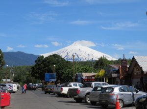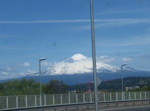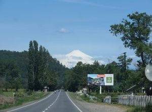 Nach dem Frühstück ging es weiter in Richtung Pucón. Schon eine Stunde vor unserer Ankunft sahen wir die schneebedeckte Spitze des Vulkans Villarica in der Ferne im Sonnenlicht schimmern. Wir verabschiedeten uns von dem Plan auf den Vulkan zu steigen, das schien uns bei den Schneemengen unmöglich.