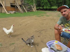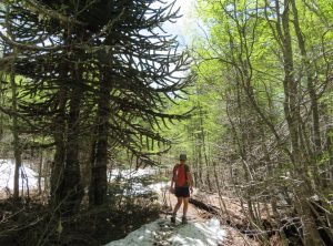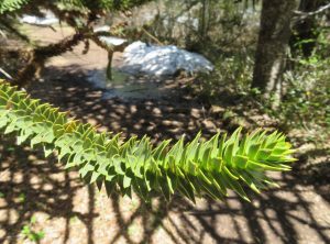 Gestärkt starteten wir unsere Wanderung etwas mehr als 900 Meter aufwärts durch den Wald. Vorbei an einem See bis hin zu den seltenen und äußerst stacheligen, riesigen Araukanienbäumen. Da oben lag dann auch bald überall Schnee und der Weg weiter aufwärts war noch nicht gut zu begehen. Wir entschieden an diesem Tag unsere Kräfte zu schonen und traten den Rückweg an. Nach etwa 5 h standen wir wieder am Auto. Da uns der Platz gut gefiel, picknickten wir nochmals am Auto und wieder mit Gesellschaft. Nach einer Weile gesellte sich die kleine Katze und ein Huhn zu uns.